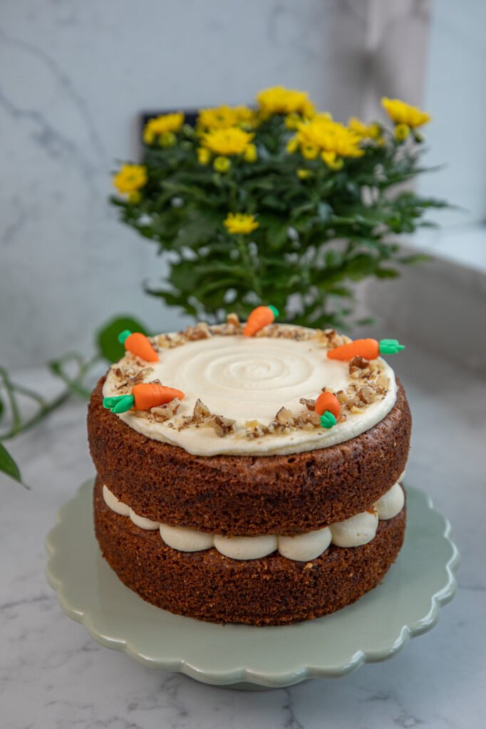 2. Sprautið kremi ofan á kök­una og fletjið það út í hring, dreifið svo söxuðum val­hnet­um með fram kant­in­um og skreytið með gul­róta skrauti, ég gerði litlar gulrætur ú sykurmassa.