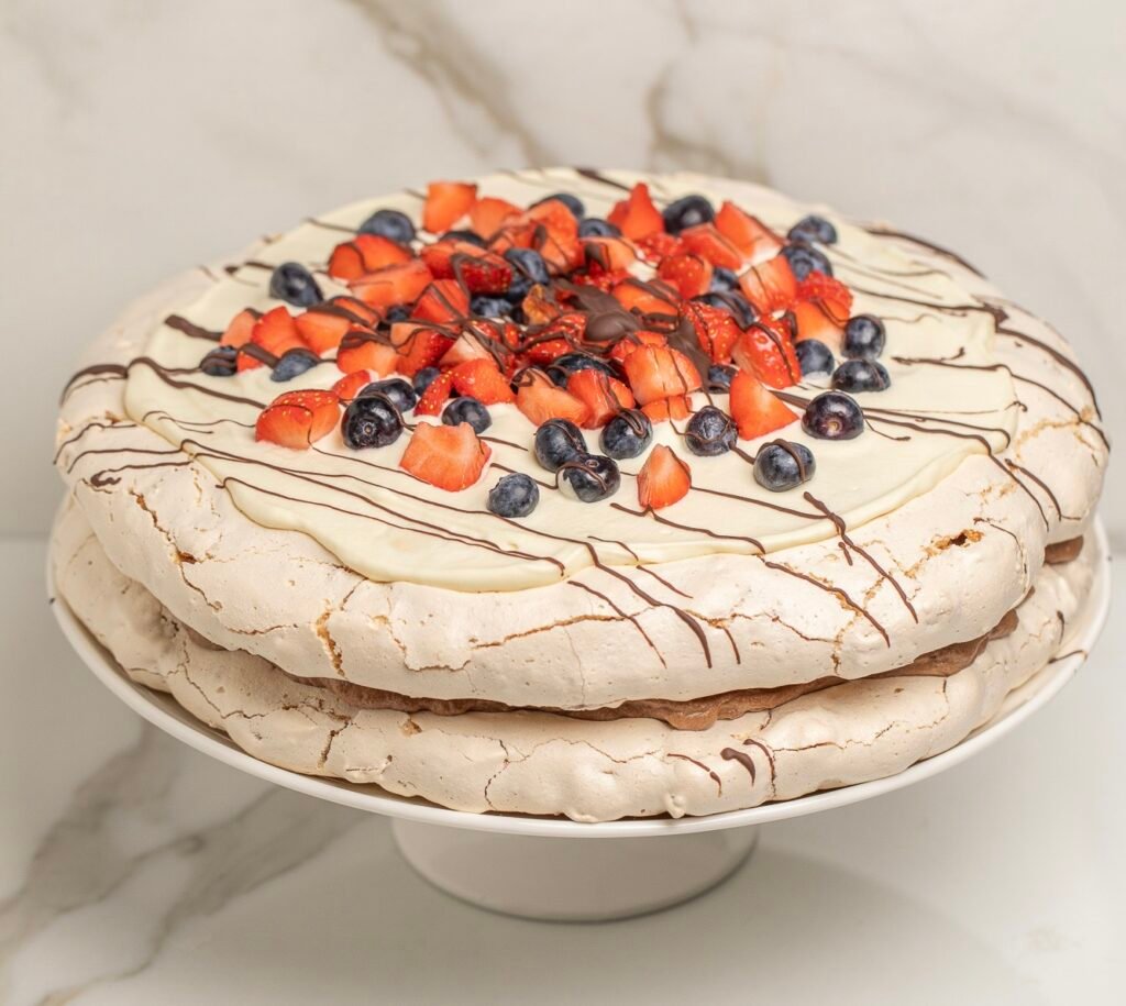 - Leggið hin marengsinn ofan á og smyrjið restina af rjómanum yfir. Dreifið síðan restina af berjunum ofaná og drizzlið restina af súkkulaðinu ofaná. Gott er að geyma tertuna inn í ísskáp í 2 klst + og berið síðan fram og njóta.